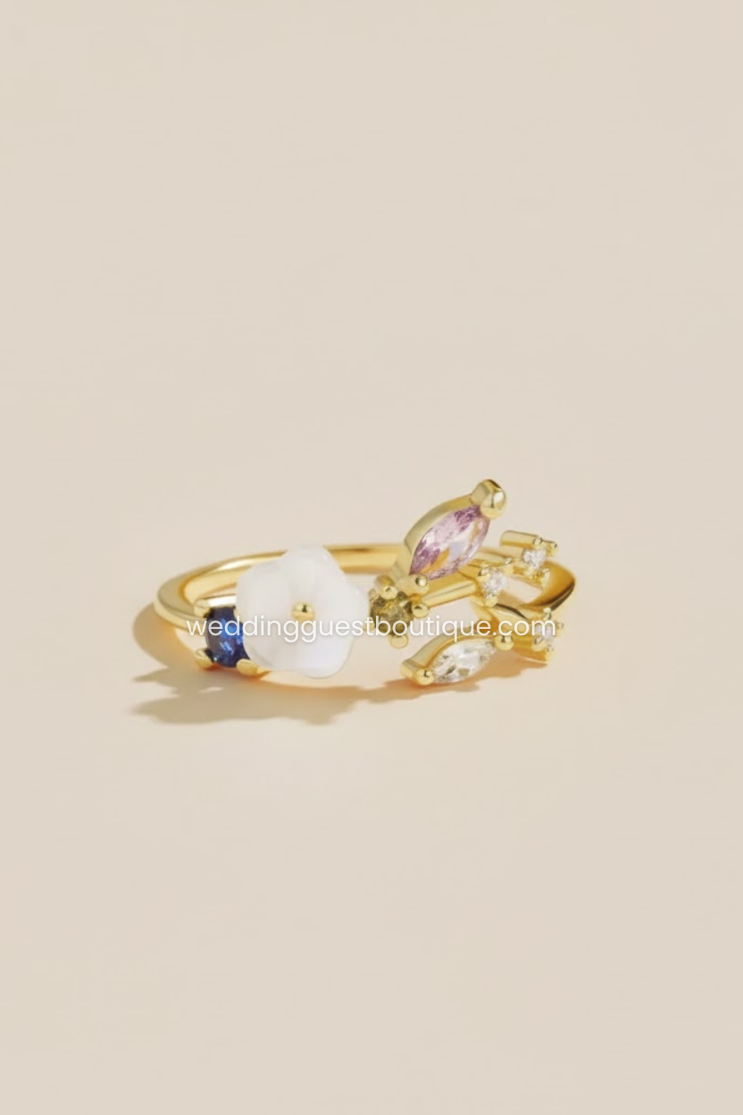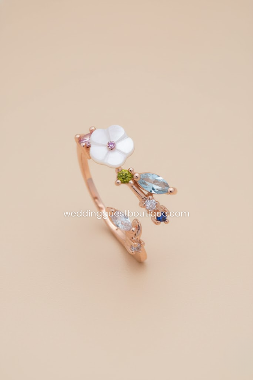 Embrace timeless elegance with the Elsie ring, a delicate piece that embodies the beauty of nature in full bloom. Featuring a graceful floral design with shimmering accents, this ring adds a touch of sophistication and femininity to any look. Its adjustable fit ensures comfort while maintaining a refined, radiant charm for every occasion.