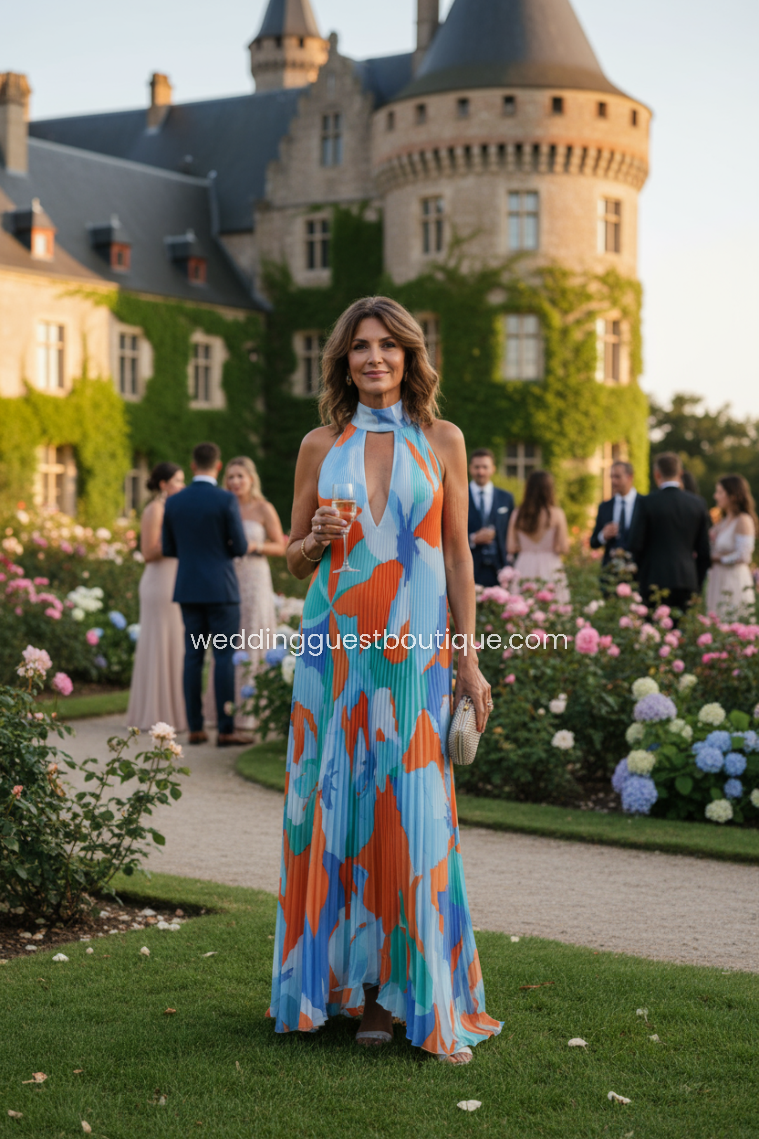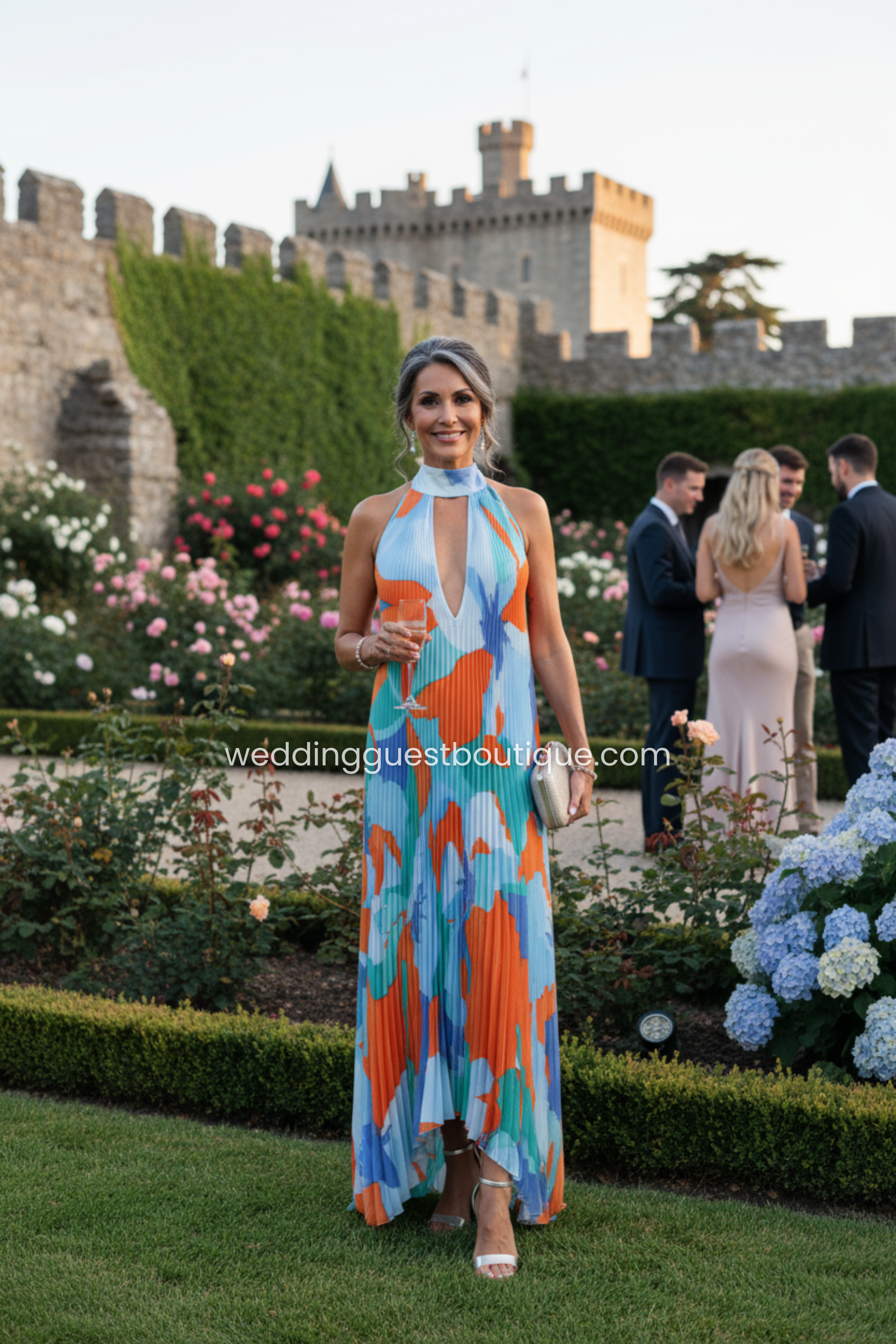 Features a halter neckline with a fitted waist and flowing pleated skirt for a flattering silhouette. Available in sizes XS–XL for the perfect tailored fit.