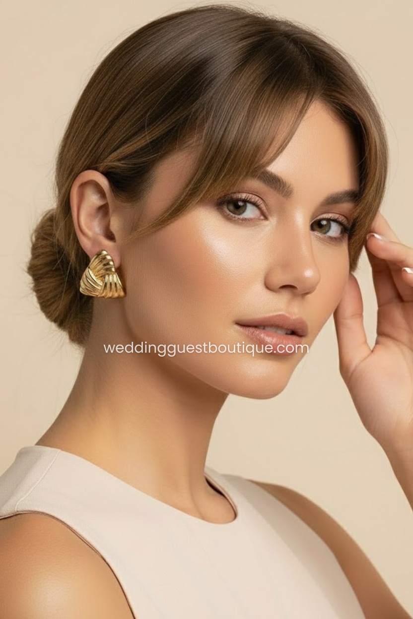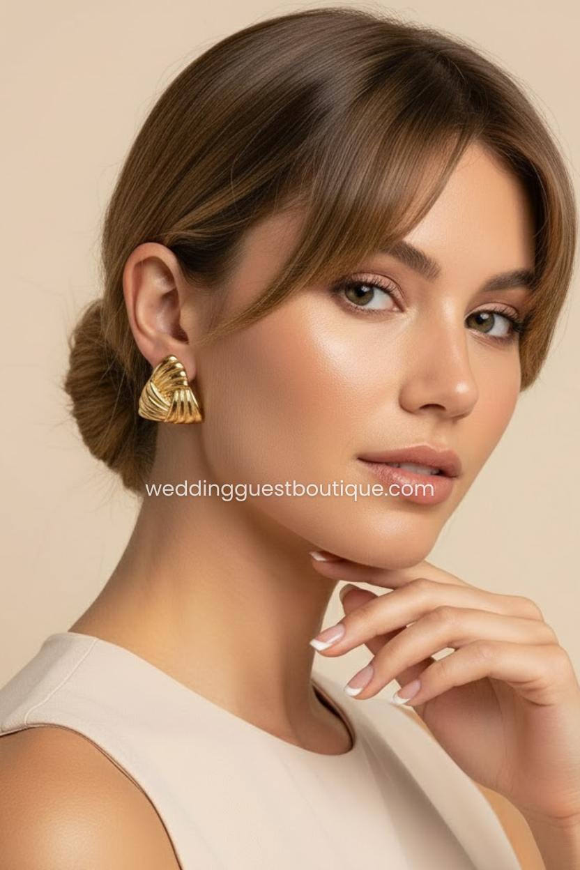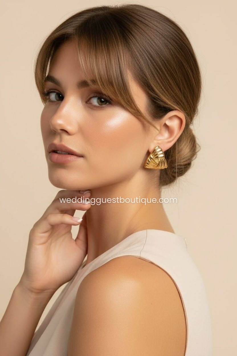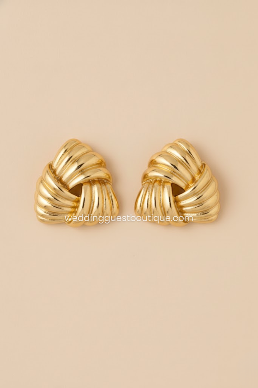 Command attention with the Emeryn earrings, a striking fusion of modern design and timeless sophistication. Featuring a bold triangular silhouette with sculpted folds and a polished gold finish, these earrings reflect light beautifully from every angle. Minimalist yet powerful, they embody the perfect balance between contemporary artistry and elegant simplicity.