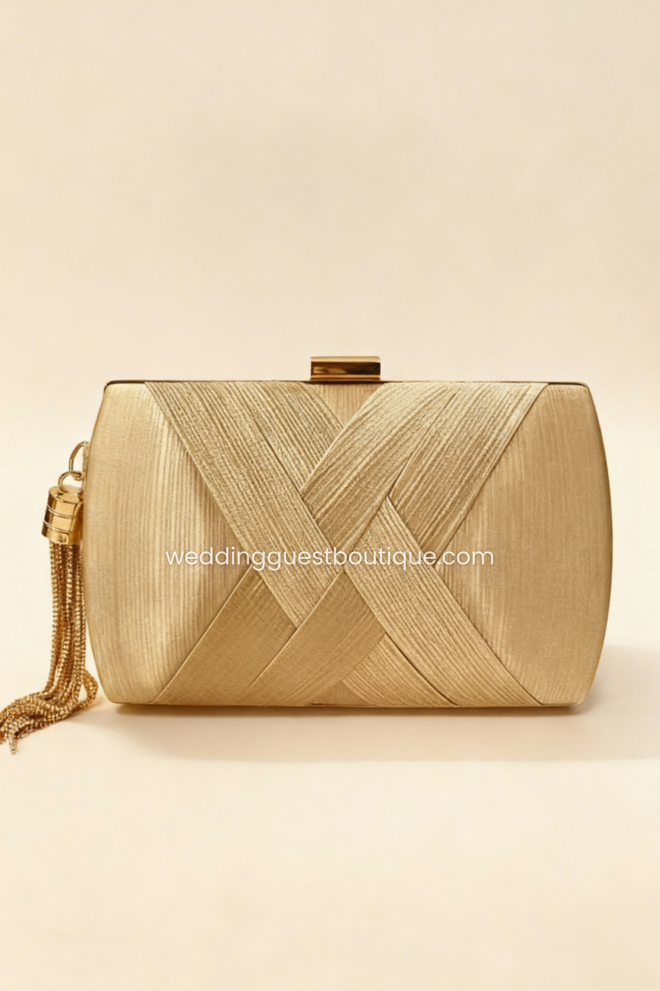 Crafted from premium-quality satin with a crisscross textured overlay, complemented by gold-tone hardware for a touch of shine and durability.