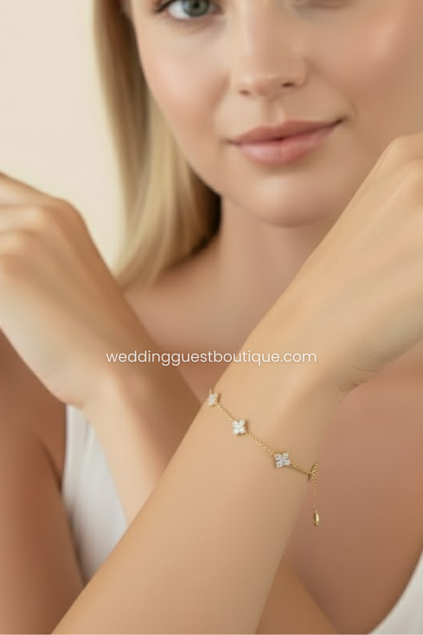 Embrace subtle sophistication with the Maisie bracelet, a dainty clover design that captures charm and elegance in its purest form. Adorned with shimmering zircon crystals and plated in radiant 18K gold or silver, this bracelet drapes beautifully across the wrist for an effortlessly graceful finish. Perfect for adding a touch of sparkle to your everyday style or complementing an evening ensemble with delicate refinement.