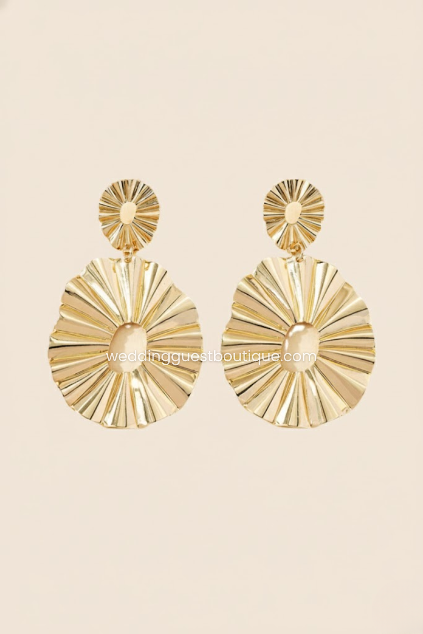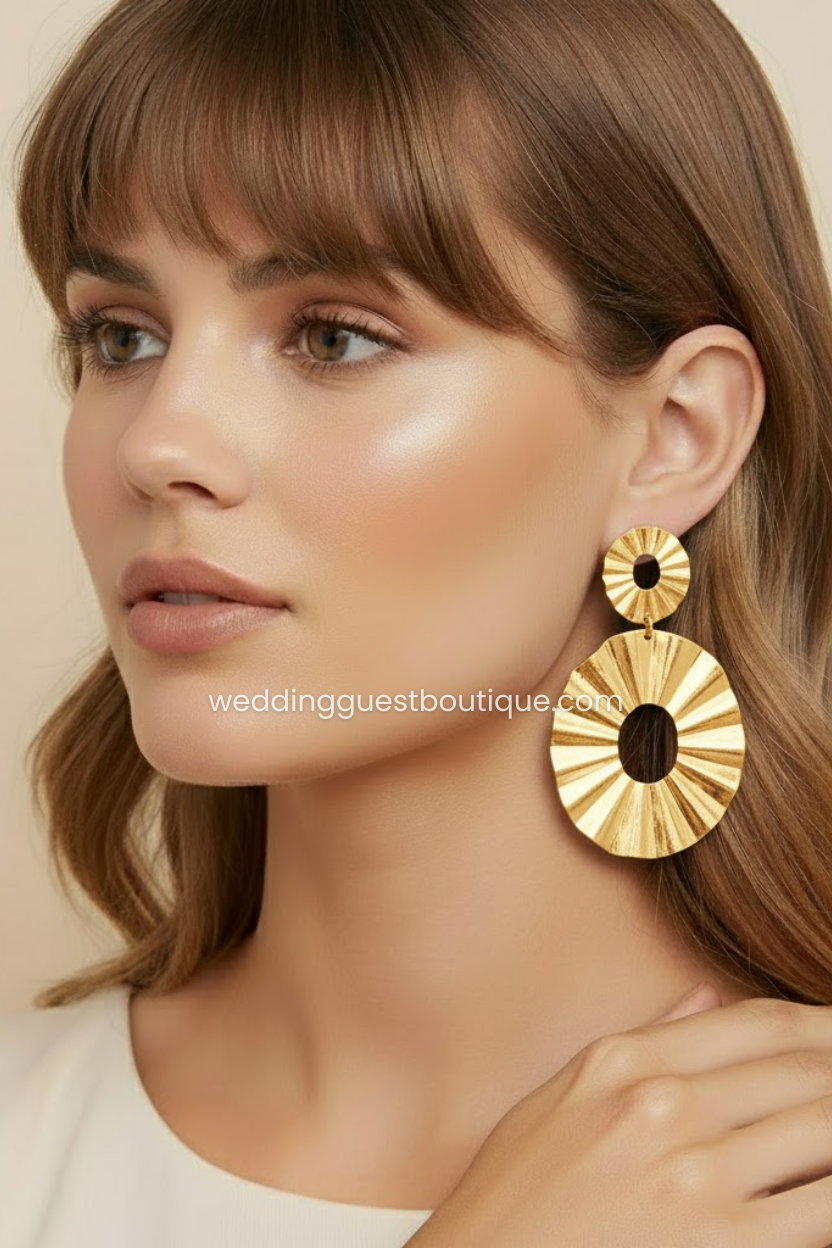 Command attention with the Ophelia earrings, a radiant statement piece designed to capture light and admiration from every angle. Featuring a dual-disc silhouette with a beautifully textured gold finish, these earrings combine bold artistry with timeless elegance. Their sculptural design and luminous sheen make them the perfect blend of sophistication and confidence for any occasion.