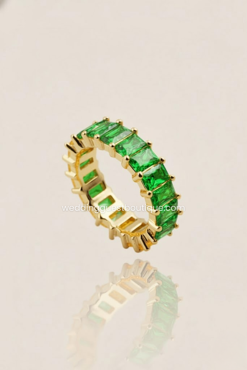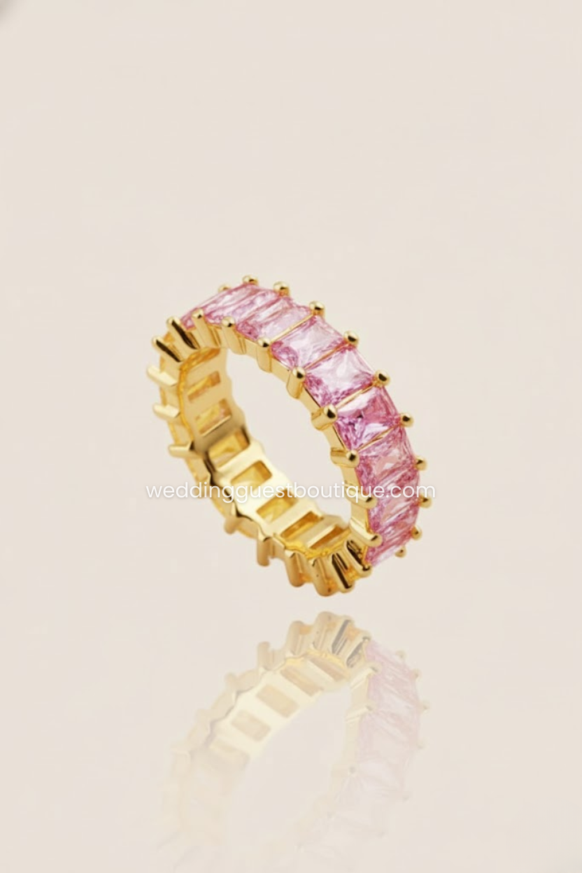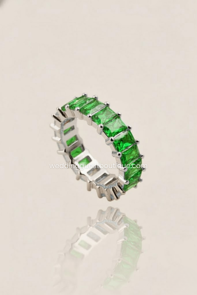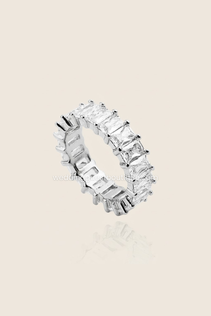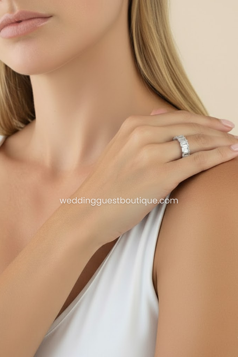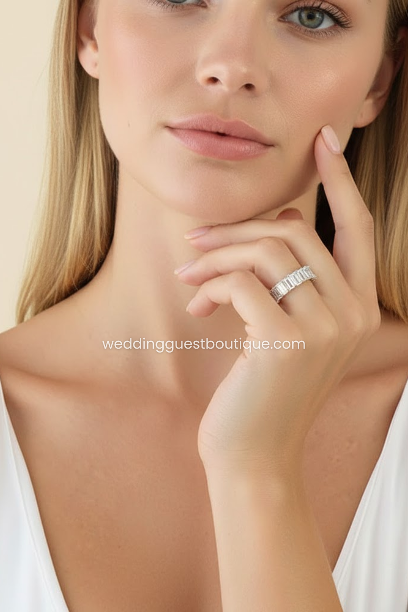 Features a full band of baguette-cut zirconia crystals, symbolizing eternity and endless elegance. The smooth inner band ensures a comfortable fit for everyday wear.